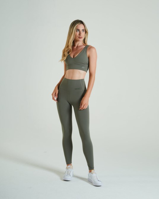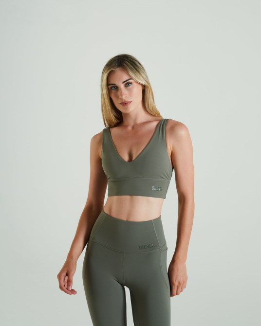 Superweicher Stoff-BH Mit überlappendem Detail An Der Seite Und Logo Aus Silikonkautschuk. Modell Trägt XS. Es Wird Empfohlen, Dass SIE Bei Ihrer Normalen Größe Bleiben. 78 % Polyester, 22 % Elastan