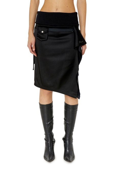 Regular-Fit-Rock Aus Super-Stretch-Satin, Der Eine Asymmetrische Silhouette Mit Drapierten Details Und Einer Gerippten Wendetaille Zur Schau Stellt. Abgeschlossen Mit Einem Abnehmbaren Tape-Gürtel Mit Einer Kleinen Pattentasche.