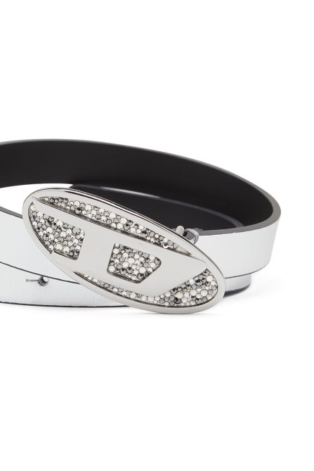 Dieser Damengürtel Ist Aus Silberfarbenem Leder Geschnitten. Es Zeigt Eine Ovale D-Logo-Schnalle, Die Mit Kristallen In Verschiedenen Farbtönen Und Größen Besetzt Ist.