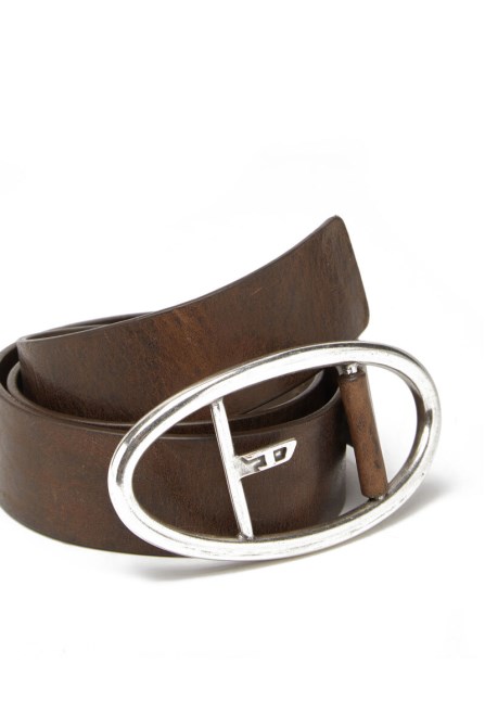 Geschmeidiger Ledergürtel Für Damen Mit Quadratischer Spitze. Die Große Ovale Metallschnalle Ist Mit Einem Kleinen „D“-Logo Verziert.
