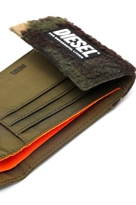 Zweifach Gefaltete Geldbörse Mit Klettverschluss Und Umschaltbarem Umhängeband. Es Ist Aus Strapazierfähigem Nylon Gefertigt Und Verfügt über Camouflage-Besätze Aus Shearling-Imitat Und Einen Logo-Patch Aus Gummi.