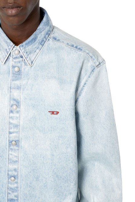 Beschichtetes Jeanshemd Für Herren Aus Der FW Runway Show Collection '22. This Model Wird With Druckknöpfen Geschlossen Und Hat One Schlichte, Normal Geschnittene Silhouette. Der Feste Denim Strahlt Einen Destroyed-Look Aus, Mit Abschürfungen An Den Taschen Und Beinen. Das Besonders Glänzende Finish Wird Durch Eine Kombination Aufwändiger Fertigungstechniken Erreicht, Beginnend Mit Einer Wärmebehandlung Und Einer Speziellen Waschung, Um Einen „Film“-Effekt Zu Erzeugen.