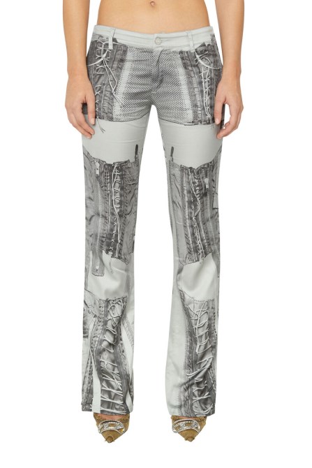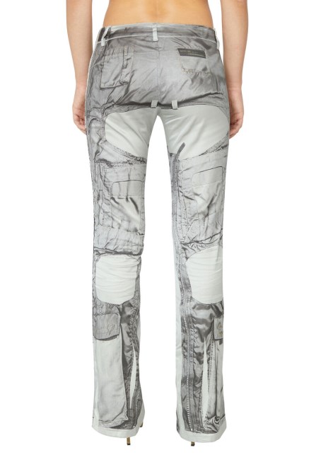 This Damenhose Ist Teil Der Runway Show-Kollektion Herbst/Winter 2022 Und Besteht Aus Elastischer Viskose Mit Einem Trompe-l'oeil-Print Im Utility-Stil. Der Druck Wird Hergestellt, Indem Das Ursprüngliche Kleidungsstück Dekonstruiert Und Jedes Stück Gescannt Wird, Um Das Endgültige Bild Zu Erstellen. Die Hose Wird Mit Haken- Und Ösenverschlüssen An Den Seiten Vervollständigt.