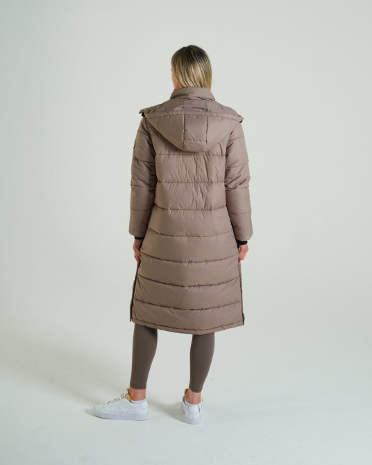 Langer, Gefütterter Daunenmantel Mit Druckknöpfen An Der Seitennaht. Gummiabzeichen Am Linken Arm Des Trägers. Modell Trägt Größe XS. Füllung Aus 100 % Recyceltem Polyester.