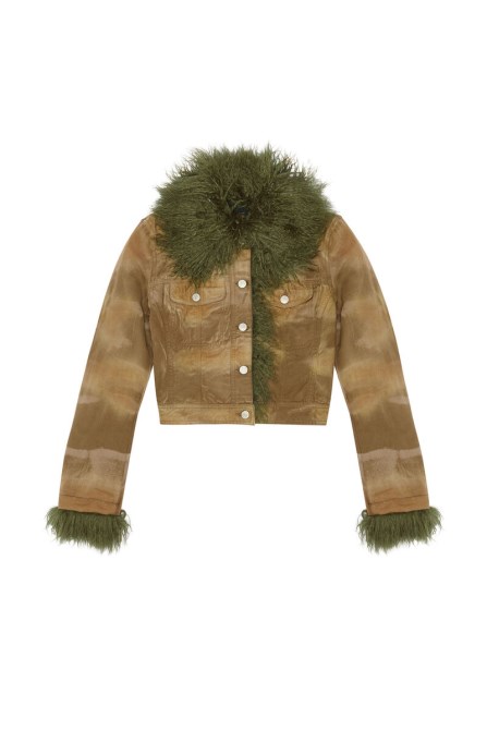 Diese Trucker-Jacke Für Damen Wurde Per Laser Verblasst, Gebatikt Und Von Hand Besprüht, Um Ein Tarnmuster In Braun- Und Grüntönen Zu Erstellen. Es Besteht Aus Baumwolle Mit Isolierender Polsterung, Hat Eine Normale Passform Und Auffällige, Zottelige Besätze.