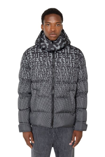 Daunenjacke Aus Wattiertem, Gestepptem Oberteil, Durchgehend Bedruckt Mit Einem Schrumpfenden Monogrammmuster. Verstellbar An Bündchen Und Saum, Das Modell Hat Eine Reguläre Passform Und Eine Abnehmbare Kapuze. Der ärmel Ist Mit Dem 'Oval D'-aufnäher Versehen.