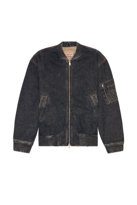 Herren Bomberjacke Mit Normaler Passform. Es Ist Aus Schwarzem Fix-Denim Gefertigt, Der Aus Baumwolle Und Hanf Gesponnen Wurde, Und Zeigt Eine Alternative Stone-Wash-Behandlung Mit Subtilen Schmutzeffekten, Die Ein Vintage-Feeling Verleihen. Dieses Kleidungsstück Ist Für Wärme, Wattiert Und Hat Ein Zwiebelgestepptes Futter.