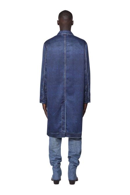 This Unisex-Automantel Ist Teil Der Runway-Kollektion Frühjahr-Sommer 2022. Es Besteht Aus Fließendem Viskose-Cady Und Ist Mit Einem Speziellen Laserdruck Mit Dem Bild Eines Authentischen Jeansstücks Bedruckt, Um Einen Trompe-l'oeil-Effekt Zu Erzeugen. Die Silhouette Ist Locker Und Geht über Das Knie.