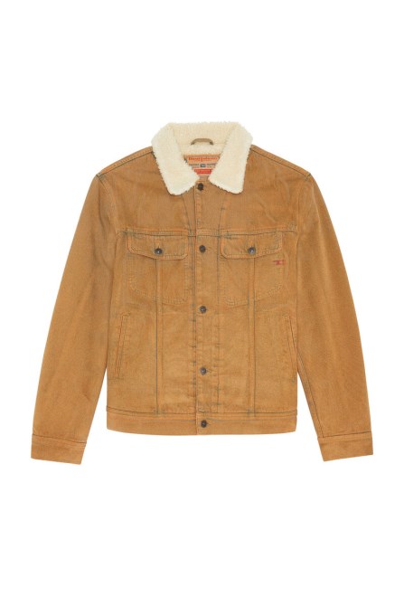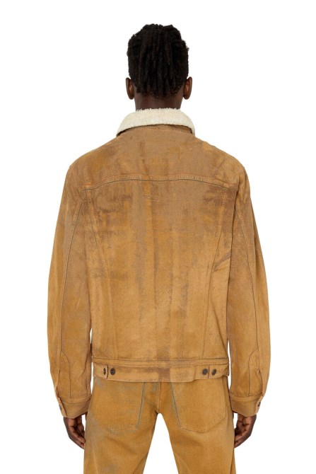 Herren-Truckerjacke Mit Normaler Passform Aus Samt-Denim. Der Weiche, Ecrufarbene Kragenbesatz Und Das Futter Bieten Isolierung Für Den Winter. Dieser In Italien Gewaschene Denim Wird Ausgehend Von Einem Vintage-blauen Fixierstoff Gefertigt, Stonewashed Und überfärbt, Um Eine Farbige Basis Zu Schaffen. Wiederverwendete Flockdrucke Und Teddyapplikationen Sorgen Für Einen Unveränderbaren Haptikeffekt.