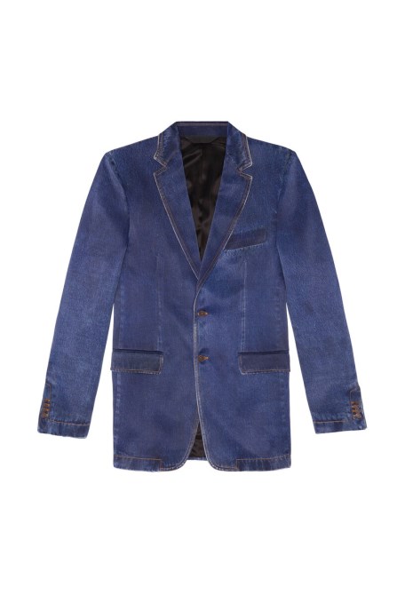 Frühjahr-Sommer 2022 Modenschau-Kollektion. This Fließende Blazer Wurde Speziell Mit Dem Bild Eines Authentischen Jeansstücks Laserbedruckt, Um Einen Trompe-l'oeil-Effekt Zu Erzeugen. Es Ist Aus Glänzendem Viskose-Cady Für Eine Normale Passform, Geschneidert Und Verfügt über Fallendes Revers, Ösenknöpfe Und Einen Doppelschlitz.