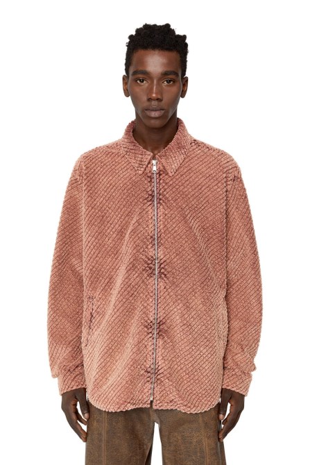 Diese Cordjacke Für Herren Ist Teil Der Runway Show-Kollektion Herbst/Winter 22. Es Ist Mit Groben Diagonalen Rippen Strukturiert Und Hat Einen Unregelmäßigen, Verblassten Look Mit Farbflecken Entlang Des Reißverschlusses.