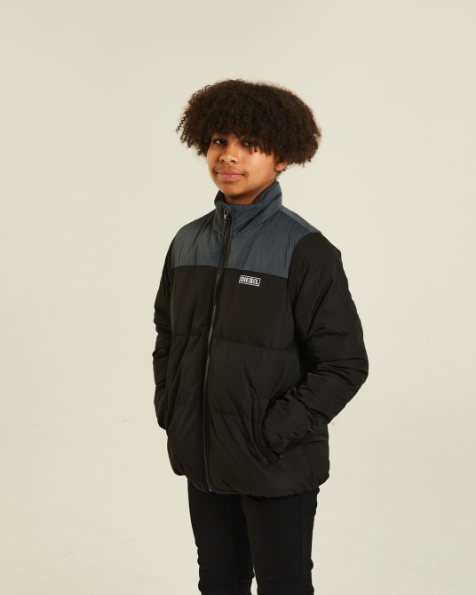 Kinder-Puffjacke Mit Zweifarbigem Einsatz. Logo Auf Der Brust.