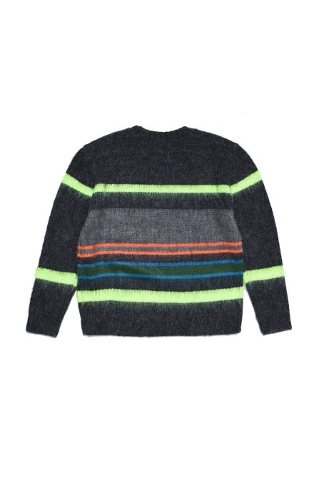 This Wollmischpullover Für Jungen Ist Mit Mohair Gesponnen, Um Seine Charakteristische Flauschige Textur Zu Erhalten. Seine Schwarzgraue Basis Ist Mit Unregelmäßigen Streifen In Fluoreszierenden Tönen Erhöht.