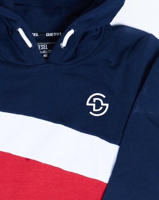 Retro-Panel-Kapuze Für Jungen. Gestreiftes Farbfeld Mit Logo Und Gewebtem Abzeichen
