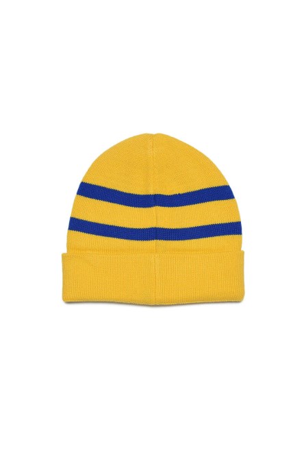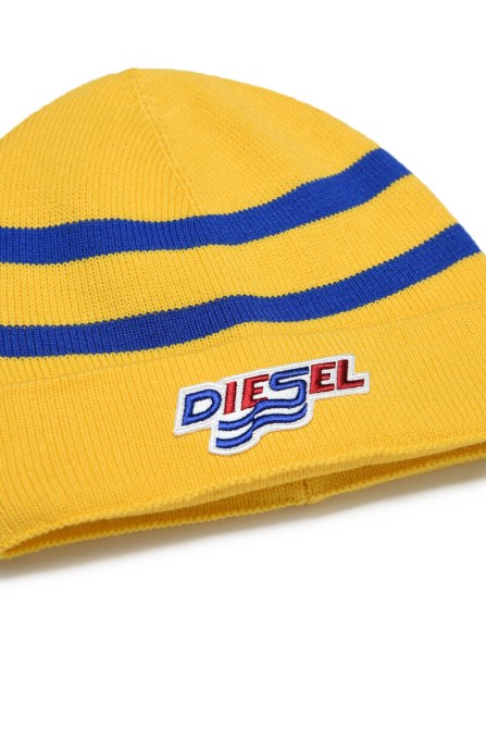 Gestreifte Jungenmütze Aus Acrylgarn Im Rippenstrick, Am Bündchen Mit Einem Gestickten Logo-Patch Verziert.