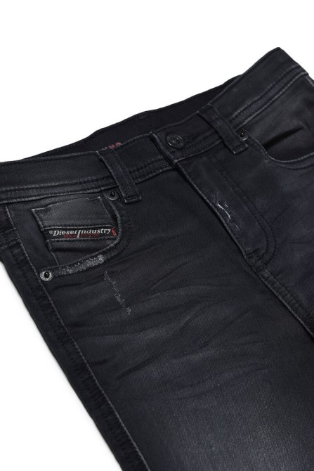 Superschmaler Style Mit Hoher Taille. Der Bund Und Das Design Der 5. Tasche Sind Von Den Diesel-Archiven Inspiriert. This Denim Ist Aus JoggJeans-Stoff Für Höchsten Komfort Gefertigt Und Verfügt Über Eine Schwarze Waschung Mit 3D-Whiskers Und Laserabrieb. Der Used-Look Wird Durch Kleine Verzierte Und Reparierte Details Verstärkt.