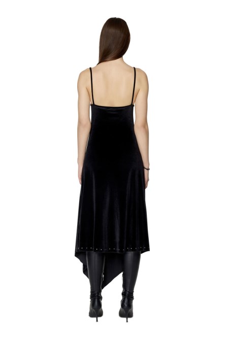 Dieses Midikleid Besteht Aus Weichem Und Elastischem Velours. Es Ist Entlang Des Fließenden, Asymmetrischen Saums Mit Kristallen Besetzt, Sitzt Eng Am Oberteil Und Hat Einen Wasserfallausschnitt. Eine Ovale Logoplakette Akzentuiert Einen Der Schultergurte.