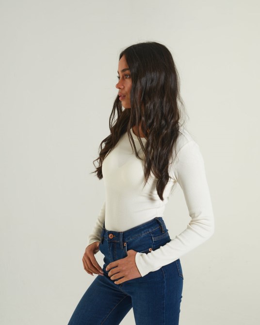 Gerippter Langarm-Bodysuit Mit Rundhalsausschnitt Und Druckknopfverschluss Unten. Das Modell Trägt Größe S. Dieses Kleidungsstück Fällt Der Größe Ein Aus. 95 % Baumwolle, 5 % Elastan
