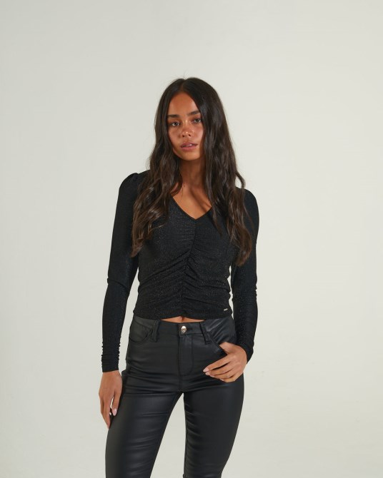 Lurex-Oberteil Mit V-Ausschnitt Und Rüschen Vorne In Der Mitte. Abgerundet Mit Einem Diesel-Metallabzeichen Am Saum. Das Modell Trägt Größe XS. Dieses Kleidungsstück Fällt Der Größe Nach Aus. 95 % Polyester, 5 % Elasthan