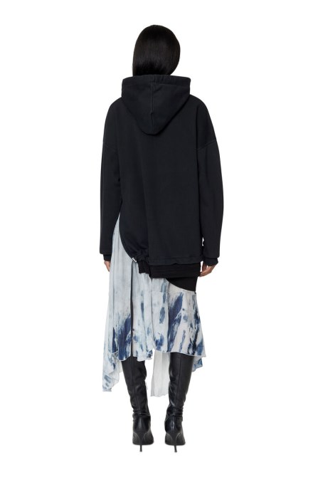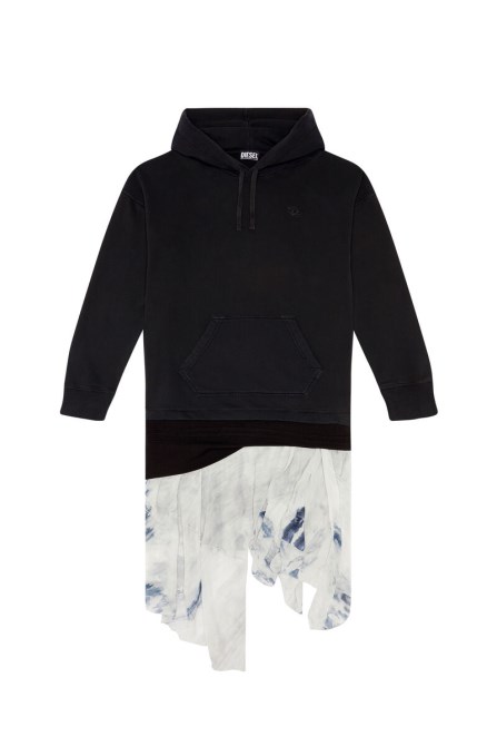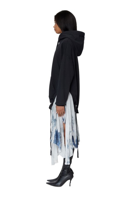 Hoodie-Kleid Aus Loopback-Baumwolljersey Mit Geteiltem Kordelzugsaum Und Asymmetrischem Chiffon Mit Digitalem Denim-Print. Sein Lockeres Profil Ist Mit überschnittenen Schultern Erhöht Und Mit Einem Gestickten Ovalen D-Logo Versehen.