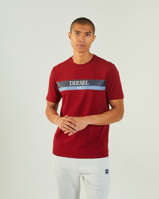 Herren-T-Shirt Aus Baumwoll-Stretch-Jersey Mit Superweicher Oberfläche. Stretch Für Komfort Und Bewegung Hinzugefügt. Diesel-Gummidruck Auf Der Brust. Kombinieren Sie Es Mit Unserem Hogan Jogger Für Einen Kompletten Look. Das Model Trägt M. Es Wird Empfohlen, Bei Ihrer Normalen Größe Zu Bleiben. 95 % Baumwolle / 5 % Elastan
