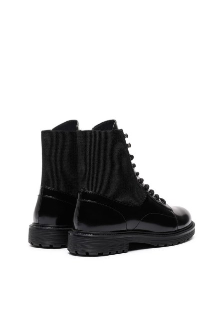 Diese Kampfstiefel Für Männer Sind Mit Einem Dehnbaren, Gerippten Einsatz Auf Der Rückseite Für Eine Flexible, Eng Anliegende Passform Ausgestattet. Sie Sind Aus Glänzendem Schwarzem Leder Gefertigt Und Haben Eine Zunge Mit Logoprägung Und Eine Klobige Stollensohle.