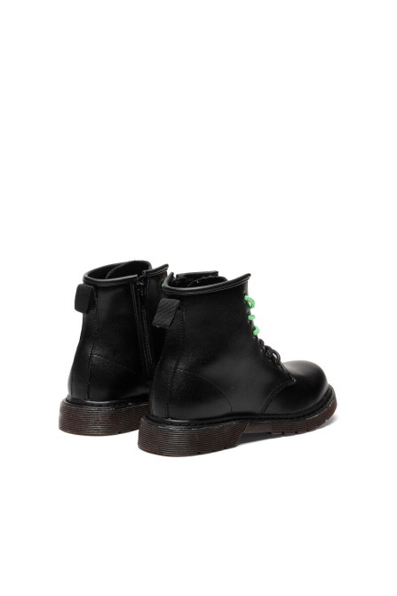 Lederstiefel Mit Seitlichem Reißverschluss Und Schnürverschluss. Die Schuhe Werden Mit Zwei Paar Schnürsenkeln Geliefert: Eines In Schwarz, Das Andere In Neongrün Für Einen Hauch Von Farbe.