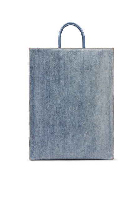 Diese Große Unisex-Tasche Ist Der Neuen Papier-Einkaufstüte Nachempfunden, Die In Diesel-Läden Verwendet Wird. Es Ist Aus Blauem Denim Mit Marmoreffekt Und Transparentem Finish Gefertigt Und Mit Einem Lasergedruckten Logo Und Lederdetails Versehen.