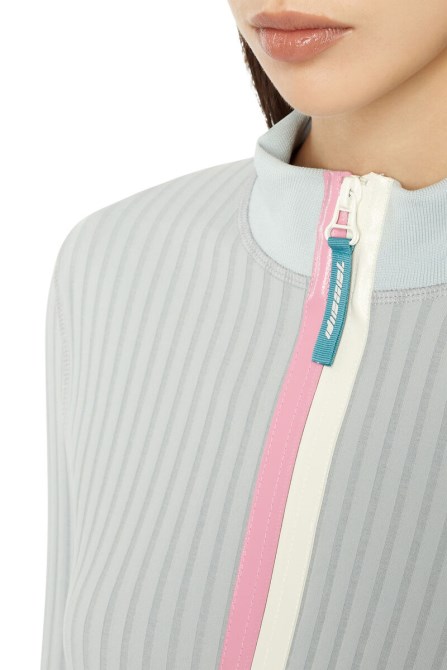 Dieser Stretch-Cardigan Für Damen, Der Auf Der H/W 22-Laufstegshow Zu Sehen War, Hat Eine Dezente Rippstrickstruktur Und Eine Figurbetonte Passform. Es Ist Farbblockiert Mit Zweifarbigem, Glänzendem Band Am Reißverschluss Und Mit Einem Gestickten DSL-Patch Auf Der Rückseite.