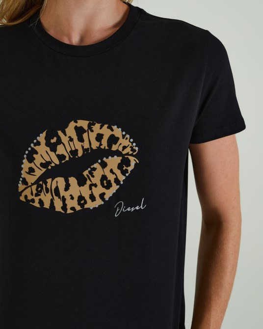 T-Shirt Mit Lippendruck Auf Der Brust. Modell Trägt XS. Es Wird Empfohlen, Dass SIE Bei Ihrer Normalen Größe Bleiben. 95 % Baumwolle, 5 % Elastan