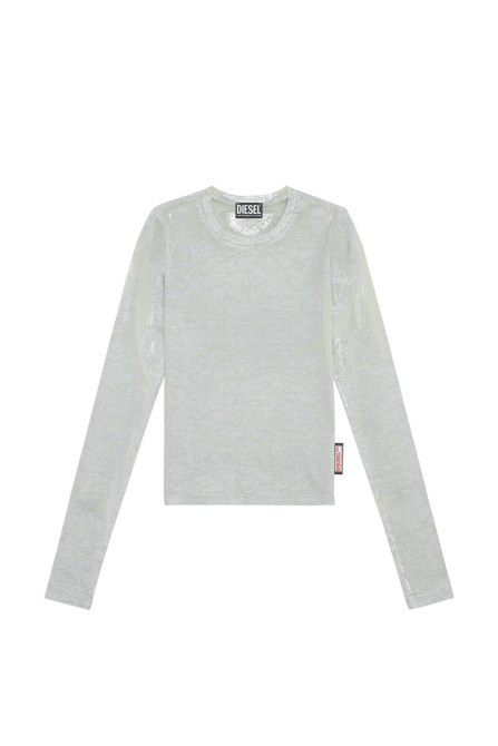 Dieses Schmal Geschnittene Damen-T-Shirt Ist Aus Grauer, Gerippter Baumwolle Gefertigt. Sein Allover-Crack-Print Wird Durch Eine Steinwaschung Akzentuiert Und Mit Einem Silikon-Finish Für Ein Gummiartiges Gefühl Behandelt. Detailliert Mit Logo-Tags Auf Der Rückseite Und Der Seite.