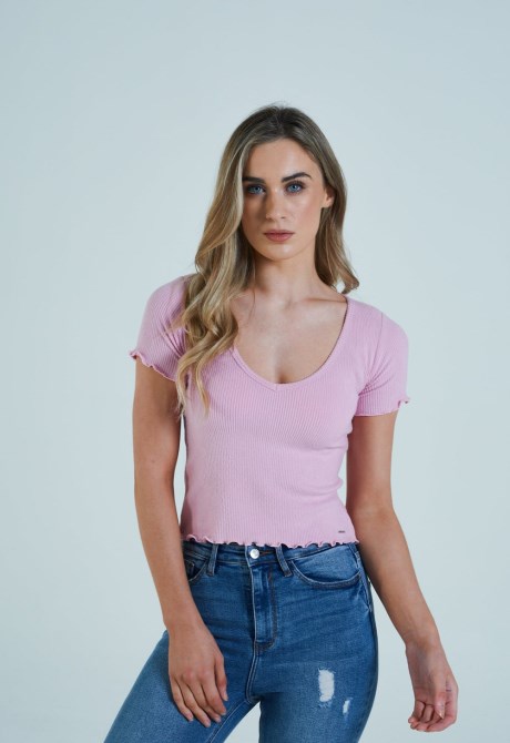 Kurz Geschnittenes, Superweiches, Geripptes T-Shirt Mit V-Ausschnitt Und Salatfarbenen Säumen. Abgerundet Mit Einem Diesel-Metallabzeichen. Modell Trägt XS. Es Wird Empfohlen, Dass SIE Bei Ihrer Normalen Größe Bleiben. 92 % Viskose, 8 % Elasthan