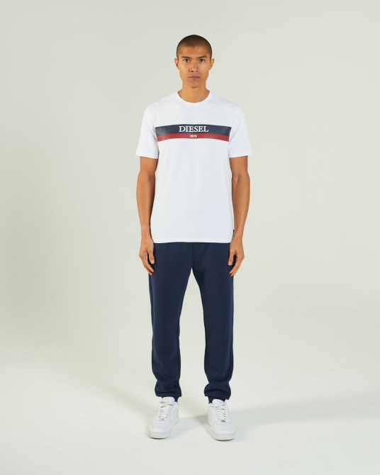 Herren-T-Shirt Aus Baumwoll-Stretch-Jersey Mit Superweicher Oberfläche. Stretch Für Komfort Und Bewegung Hinzugefügt. Diesel-Gummidruck Auf Der Brust. Kombinieren Sie Es Mit Unserem Hogan Jogger Für Einen Kompletten Look. Das Model Trägt M. Es Wird Empfohlen, Bei Ihrer Normalen Größe Zu Bleiben. 95 % Baumwolle / 5 % Elastan