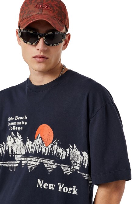 Dieses T-Shirt Aus Baumwolljersey Ist Locker Geschnitten. Der Berglandschaftsdruck Auf Der Vorder- Und Rückseite Weist Eine Rissige Struktur Auf, Die Mit „Lido Beach Community College“- Und „New York“-Schriftzügen Auf Der Brust Abgerundet Wird.