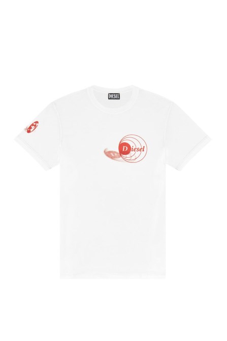 Herren T-Shirt Aus Leichtem Baumwolljersey. Das Schmal Geschnittene Design Mit Seitlichen Schlitzen Ist Mit Einem Kreisförmigen Diesel-Logo Auf Der Brust Bedruckt. Durchscheinende Logos, Die Auf Der Innenseite Der Brust Und Des Ärmels Aufgedruckt Sind, Erstellen Einen Verblassten Effekt.