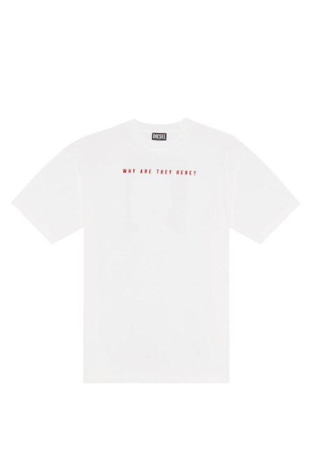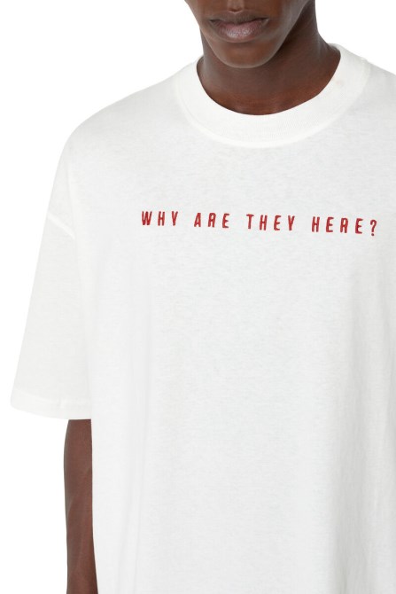 Weit Geschnittenes Herren-T-Shirt Aus Baumwolljersey, Das Sich Dank Der Beschaffenheit Des Garns Rau Anfühlt Und Einen Vintage-Look Hut. Detailliert Mit Gesticktem „Why Are They Here“-Schriftzug Auf Der Brust Und Einem Thermobilddruck Auf Der Rückseite.