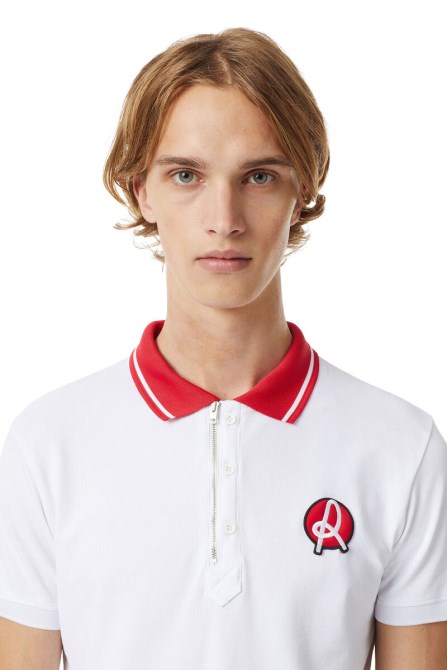 Teil Des Diesel X L.R. Vicenza Capsule Collection, Dieses Poloshirt Aus Baumwolle Zeichnet Sich Durch Einen Kragen Mit Knopf Und Reißverschluss Aus. Der Rote Aufnäher Von Lanerossi Vicenza Ziert Die Vorderseite.