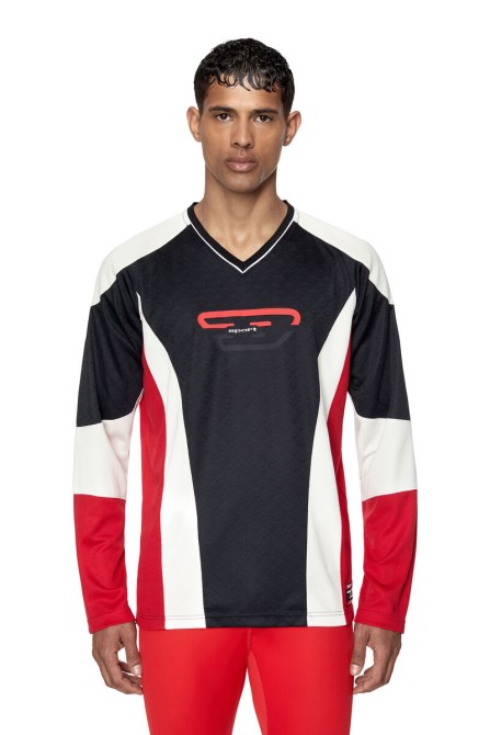 Trainingsoberteil In Normaler Passform Aus Der DIESEL SPORT-Kollektion, Das Retro-Fußballtrikots Nachempfunden Ist. Dieses Atmungsaktive Und Feuchtigkeitsableitende Modell Mit V-Ausschnitt Besteht Aus Farbblock-Einsätzen Und Leichtem Jacquard-Strick Mit Einem Glänzenden Und Matten D-Logo-Motiv. Ein Großes Grafisches Logo AdorAbleitendes FinishBleib Kühl Und Trocken Mit Stoffen, Die Feuchtigkeit Von Der Haut Wegleiten