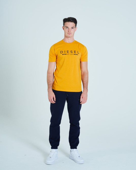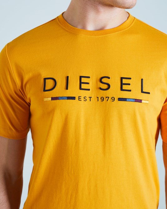 Herren-T-Shirt Aus Bio-Baumwolle Mit Gesticktem Premium-Diesel-Logo Auf Der Brust. Das Model Trägt M. Es Wird Empfohlen, Bei Ihrer Regulären Größe Zu Bleiben. 100 % Bio-Baumwolle
