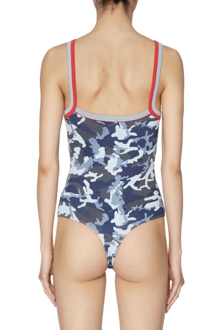 Damen-Stretch-Body Aus Bio-Baumwolle Mit Allover-Camouflage-Print. Seine Silhouette Im Tanga-Schnitt Wird Durch Rote Verzierungen An Den Trägern Und Am Ausschnitt Akzentuiert. Gebrandet Mit Einem Zentralen „D“-Logo-Patch.