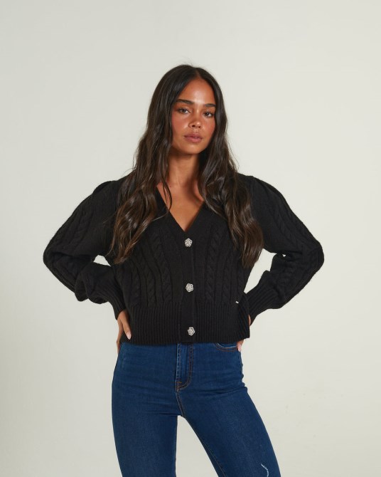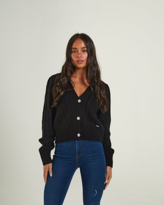 Superweicher Zopfstrick-Cardigan Mit Gerafftem Ärmelkopf, Ösenmuster Am Oberen Rücken Und Drei Funkelnden Knöpfen. Abgerundet Mit Einem Diesel-Metallabzeichen über Dem Saum.
