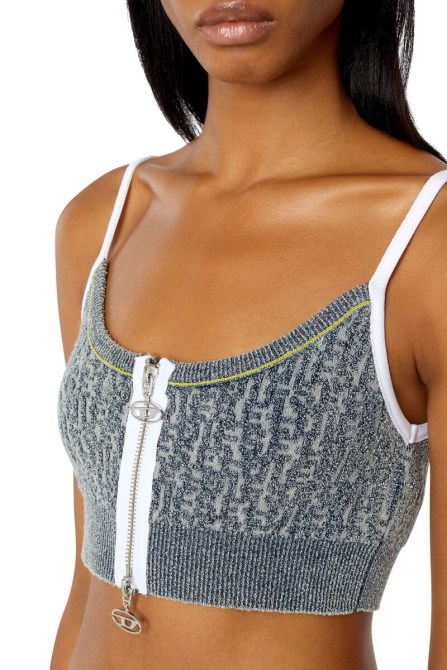 Eng Anliegendes Crop-Top Für Damen Mit Schmalen Trägern. Es Ist Teil Der Runway Show-Kollektion H/W 22 Und Aus Glatter, Gekämmter Wolle Gestrickt, Die Mit Einem Jacquard-Logomotiv Aus Griffigem Indigoblauem Boucl-Garn Gemustert Ist. Die Verwendung Von Indigo In Kombination Mit Einer Steinwaschung Verleiht Diesem Kleidungsstück Ein Denim-Feeling.