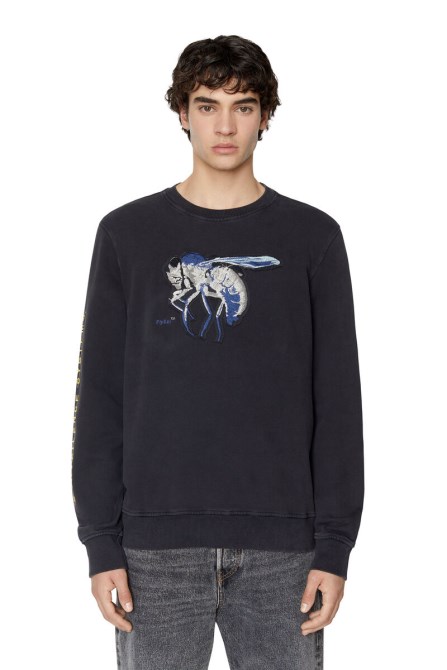 Herren-Sweatshirt In Normaler Passform Mit überschnittenen Schultern Aus Loopback-Baumwolljersey. This Style Ist Schwarz Stückgefärbt Und Leicht Mit Acid-Waschung Gewaschen. Er Hat Ein Vintage-Feeling Und Eine Auffällige Fliegengrafik, Die Auf Der Vorderseite Aufgestickt Ist.