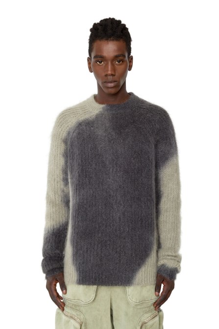 Dieser Herrenpullover Hat Eine Lockere Silhouette Und Weist An Den Ärmeln Und Seiten Hellere Farbstreifen Auf, Die Das Ergebnis Des Doppelfärbeverfahrens Sind. Es Ist Aus Einer Mohairmischung Im Rippenstrick Gestrickt Und Gebürstet, Um Das Weiche, Flauschige Gefühl Zu Verstärken.